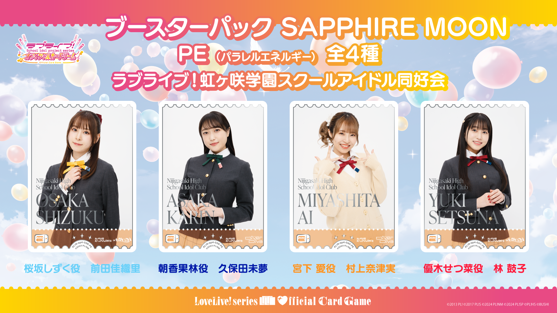 「ブースターパック SAPPHIRE MOON」には、μ's・虹ヶ咲学園スクールアイドル同好会・Liella!から2種類ずつ、特製ピンク箔入り<LLE>カードが収録されます。今回は、虹ヶ咲学園スクールアイドル同好会のカードイラストを先行公開いたしました!