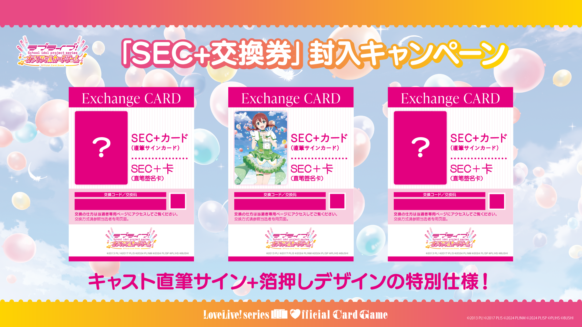 「ブースターパック SAPPHIRE MOON」を対象に「SEC+カード交換券」封入キャンペーンを実施いたします。キャストの直筆サインが施された特別使用カードSEC+(シークレットプラス)の交換券がごくごく稀に封入されています!