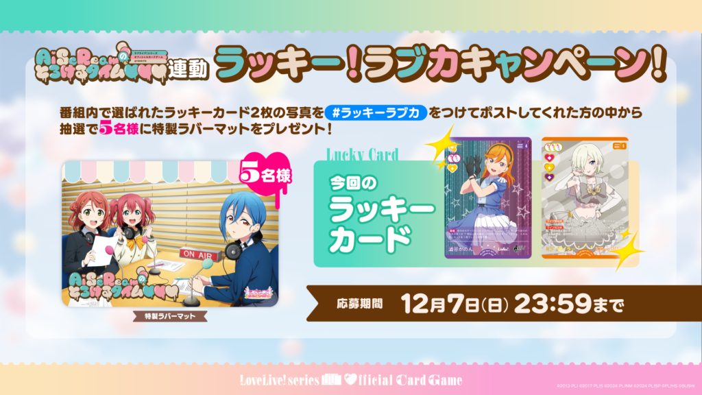 『ラブライブ!シリーズ オフィシャルカードゲーム presents AiScReam のとろけるタイム♡♡♡』内で紹介したカードが並んだ状態で写真撮影!撮影した画像を「#ラッキーラブカ」とあわせてポストで投稿すると、抽選で豪華賞品をプレゼント!
