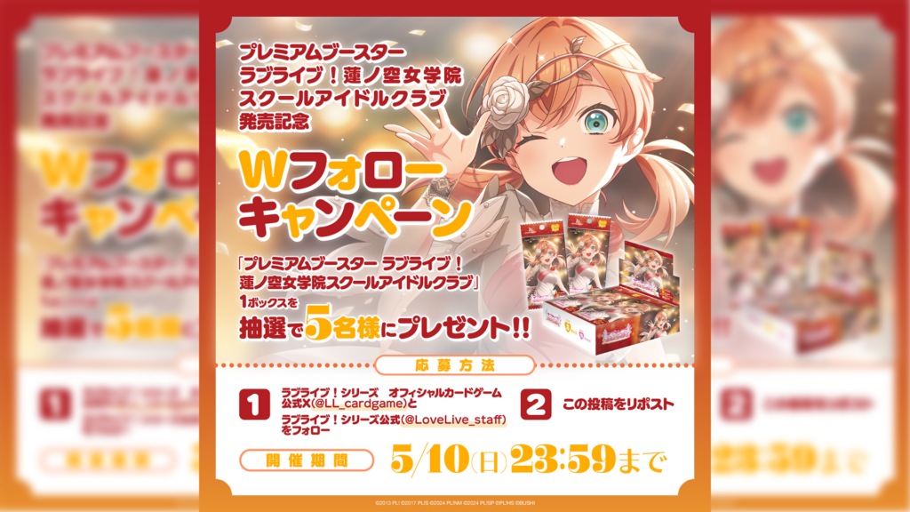「ラブライブ!シリーズ オフィシャルカードゲーム」から「プレミアムブースター ラブライブ!蓮ノ空女学院スクールアイドルクラブ」が発売されることを記念して、ラブカ公式XにてWフォロー&リポストキャンペーンを開催いたします!